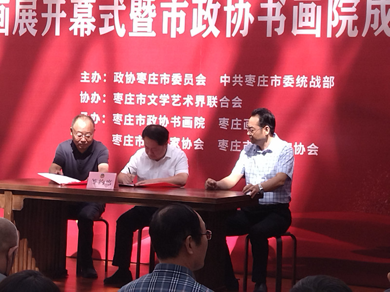 棗莊市政協(xié)主席張兵,山東省政協(xié)辦公廳一級(jí)巡視員薛相銳出席并為棗莊市政協(xié)書(shū)畫(huà)院揭牌。山東省著名書(shū)畫(huà)家張志民、張望、孟鴻聲、張宜、王居明,棗莊市領(lǐng)導(dǎo)孫恒、張德琦、張學(xué)功、劉宗國(guó)、王凌、任怡春、趙作亮,棗莊市直有關(guān)部門(mén)負(fù)責(zé)同志和部分藝術(shù)家代表參加活動(dòng)。棗莊市政協(xié)副主席曹力主持活動(dòng)。開(kāi)幕式上聽(tīng)取了棗莊市政協(xié)書(shū)畫(huà)院籌備工作情況介紹,宣讀了棗莊市政協(xié)書(shū)畫(huà)院組成人員名單,為棗莊市政協(xié)書(shū)畫(huà)院院長(zhǎng)張星斗頒發(fā)了聘書(shū),舉行了“畫(huà)里棗莊”美術(shù)創(chuàng)作工程簽約儀式和藝術(shù)作品捐贈(zèng)儀式。