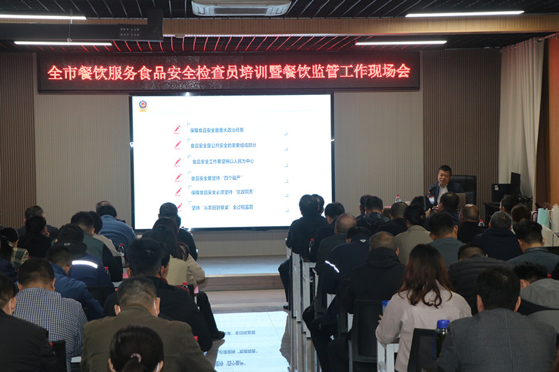 為進(jìn)一步豐富餐飲服務(wù)食品安全檢查員業(yè)務(wù)知識,提升全市餐飲環(huán)節(jié)食品安全監(jiān)管水平,棗莊市市場監(jiān)督管理局根據(jù)2023年餐飲監(jiān)管工作計劃,于11月8日,在臺兒莊古城學(xué)校召開全市餐飲監(jiān)管工作暨餐飲服務(wù)食品安全檢查員培訓(xùn)會議,市、區(qū)兩級局分管局長、餐飲科全體人員、全市餐飲服務(wù)食品安全檢查員參加。會議由市市場監(jiān)管局副局長張衍耀主持;臺兒莊區(qū)委常委、副區(qū)長孫作偉致辭,并介紹建設(shè)“食安臺兒莊”的經(jīng)驗和做法;山東省市場監(jiān)管局餐飲處一級調(diào)研員遲玉聚博士,作《深刻學(xué)習(xí)領(lǐng)會習(xí)近平總書記重要論述精神努力守住食品安全底線》主題報告。